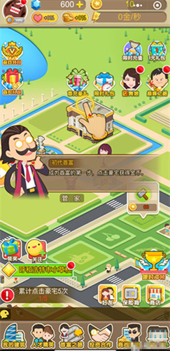 每个玩家都会从初代首富开始,一开始,玩家可能是一无所有的小草根,按照提示点击豪宅就会获得金币,每次点击都可以听到金币的声音,连续点击则可以获得更多金币。