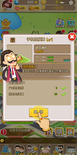 按照系统提示点击建造就可以获得赚钱建筑,选择建造手机贴膜摊,建筑的每秒收入意味着在单位时间内给玩家增加的财富,给建筑升级是非常重要的,建筑的等级越高,每秒赚的钱就会越多,所以要记得经常给建筑升级哦!