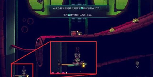 6、使用黄色杆子可以抵达高处,跳跃的高度与艾克的位置无关,松开按键即可正常往上跳。