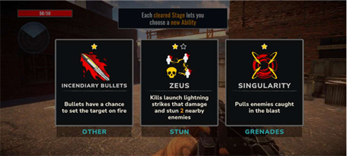 每关通过后挑选强力增益效果(像“10秒无敌”或者“弹药量增加50%”这类),依据下一关的僵尸种类来调整应对策略。