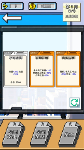 3、高自由度,无固定路线,卡牌、天赋员工自由搭配。