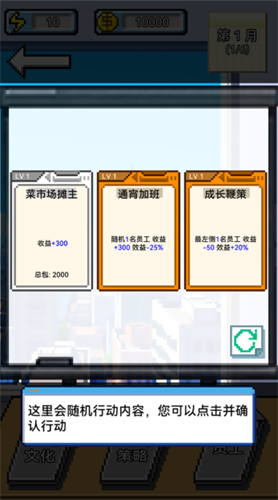 1、像素风+Roguelike+卡牌经营的商战模拟手游,主打从乡镇初创到全球商业帝国的成长线。