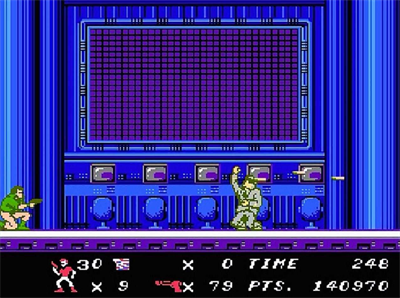 带手雷的人质在关底,终点附近的门里。本关起,暗门已经和背景差不多了,不仔细看很容易看漏。在终点会有大批敌人,和快速移动的红服兵,只要蹲下猛烈射击,通过不难。