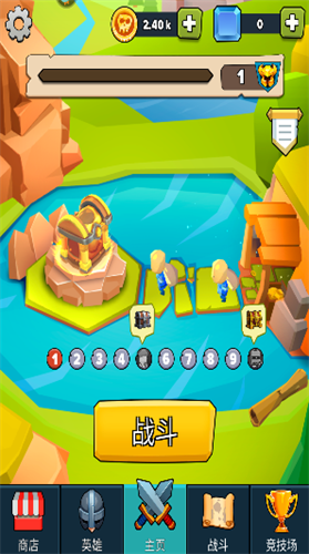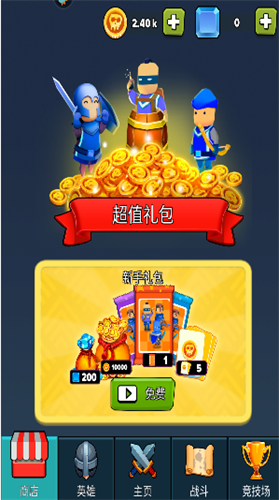 下方有商店、英雄、主页、战斗以及竞技场的模块