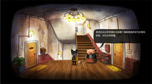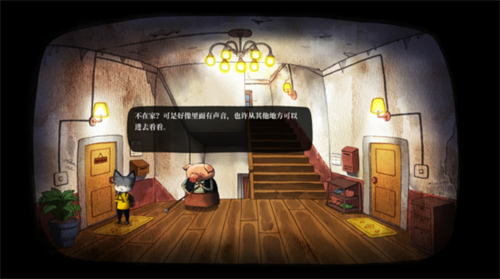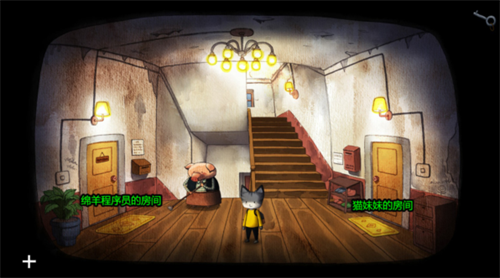 妹妹的房间里没什么东西可拿了,此时出阳台也不让出,于是回到二楼走廊,发现左边绵羊的房间也打不开,跟猪妈妈对话得知要找楼顶的狗老头