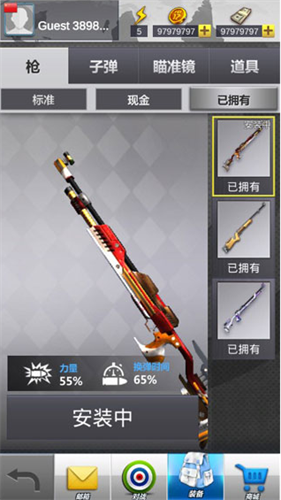 枪械的养成主要是通过购买武器、子弹和瞄准镜,虽然没有涉及强化的功能,但非常真实的各种枪械武器还是十分靓丽。