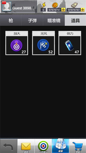除了玩法和枪械以外还设有道具,其道具主要分三种:放大,无风,体力,顾名思义名字和其意义完美匹配。