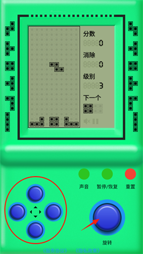 2、左侧的方向键,点击“下键”加快下落速度,“左右键”控制方向,“上键”瞬间下落,右侧的“旋转键”控制方块旋转。
