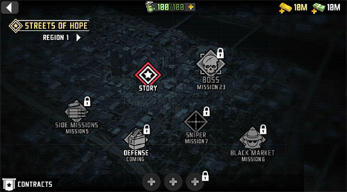 1、下载进入最后的希望3游戏,右侧的红色按钮是任务提示,右上角是金币和钞票显示。