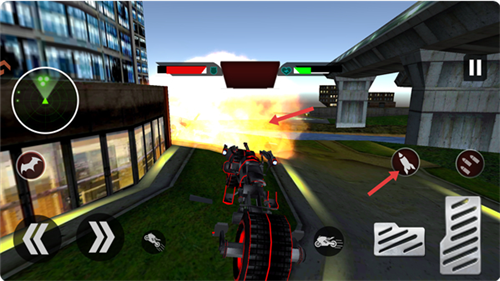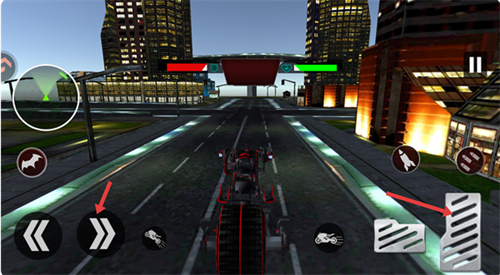 2、点击左侧【前进】按钮控制方向,右侧【油门】按钮可提升摩托行驶速度。