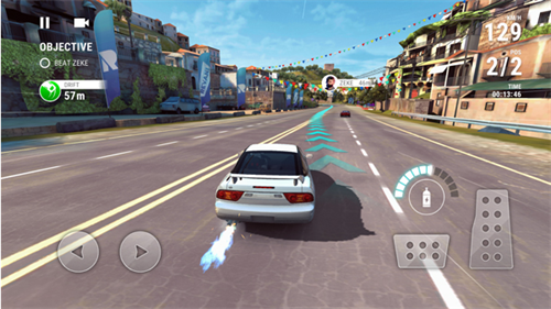 游戏则采用了经典的横版竞速闯关玩法,屏幕左边控制左右,右边则为油门、刹车、氮气等键位,赛车行驶和偏移会加快氮气获取速度,当氮气条满后即可释放氮气加速前进,最后率先到达终点的赛车取得比赛胜利。