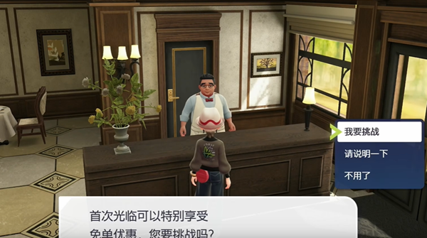 进入餐馆与NPC对话,在此处需要接受免单挑战。