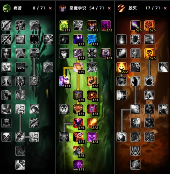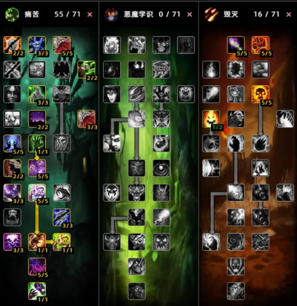 牺牲毁是很多玩家的选择,输出循环简单粗暴,主要就是打暗影箭。需要注意的是,60年代副本的DEBUFF位有限(上限16个),在团队中请根据指挥要求决定是否上腐蚀术。