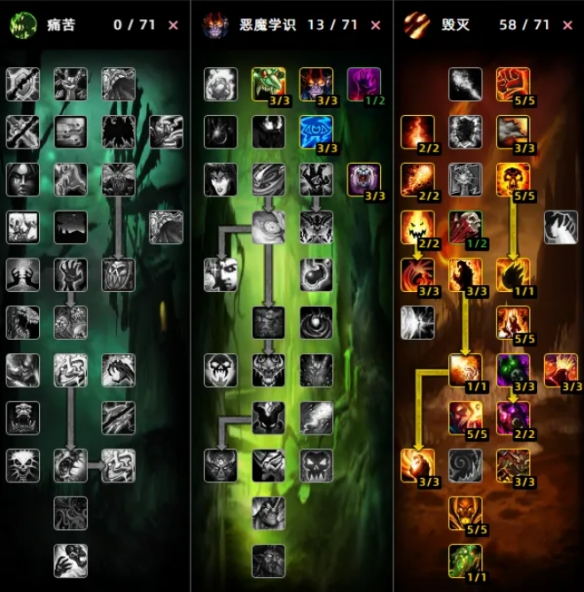 火毁则是一套华丽的秒人连招:通常魅惑起手控制,接元素诅咒,然后远距离读条灵魂火,续上献祭和点燃,最后用暗影灼烧收尾。需要注意的是,这个流派很怕被近战职业针对。